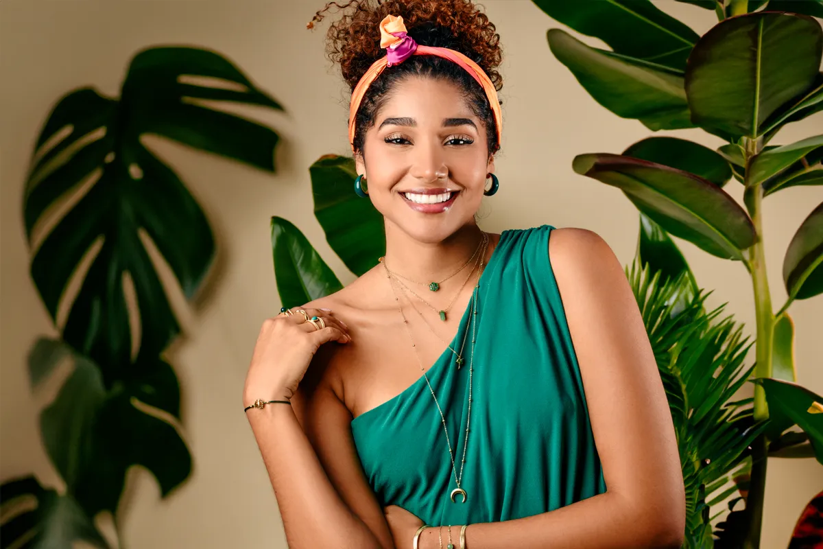 Jeśli chcesz dodać swojej stylizacji charakteru i odrobiny ekstrawagancji, postaw na biżuterię z kolorowymi kamieniami szlachetnymi. W 2026 roku to jeden z najgorętszych trendów! Ametyst (fiolet), różowy turmalin (fuksja) czy szafir (głęboki granat) to tylko niektóre z propozycji, które pięknie skontrastują z zieloną sukienką. Wybierz jeden wyrazisty element na przykład duży pierścionek z ametystem lub kolczyki z szafirami aby dodać stylizacji głębi i indywidualności. Pamiętaj, by kolor kamienia harmonizował z odcieniem zieleni.